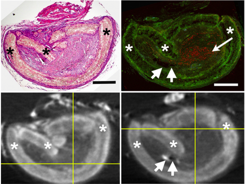 H&E stained section (top left) matched to the corresponding axial μCT image (bottom left) and a section stained with anti-NF (top right) matched to the axial μCT image (bottom right). Asterisks label nerve conduits. The long arrow points to a group of anti-NF stained axons, and short arrows point to a small pocket of fat (left) and a large blood vessel (right). Scale bars = 0.5 mm.